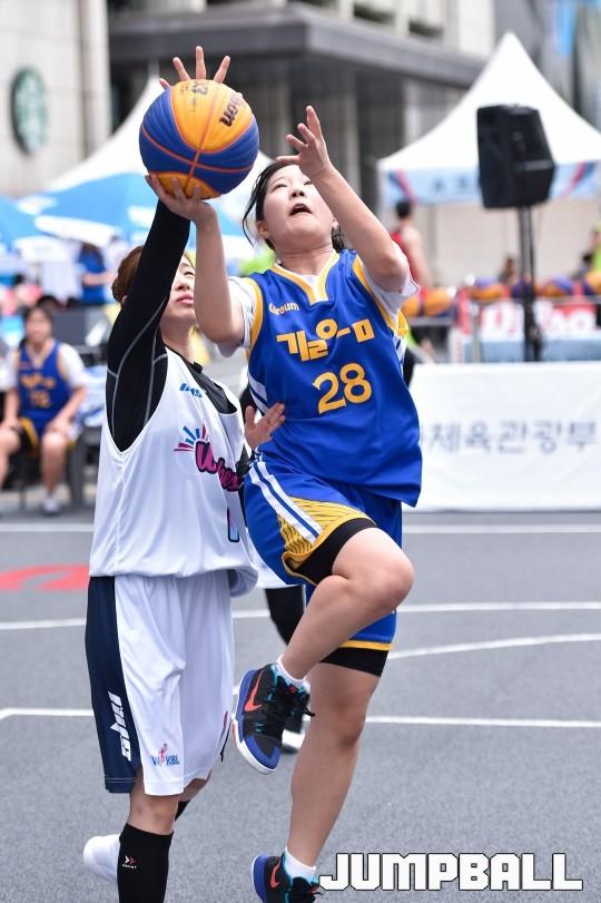 [점프볼=서울마당/윤희곤 기자] 27일 서울마당에서 열린 2018 KBA 3x3 코리아투어 서울대회 2일차 경기, 길음중학교 소속 선수가 WKBL 호프스의 수비를 피해 레이업 슛을 시도하고 있다.