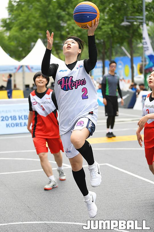[점프볼=서울마당/유용우 기자] 27일 서울마당에서 열린 2018 KBA 3x3 코리아투어 서울대회 2일차 경기, WKBL 호프스 김진희가 레이업을 올리고 있다.
