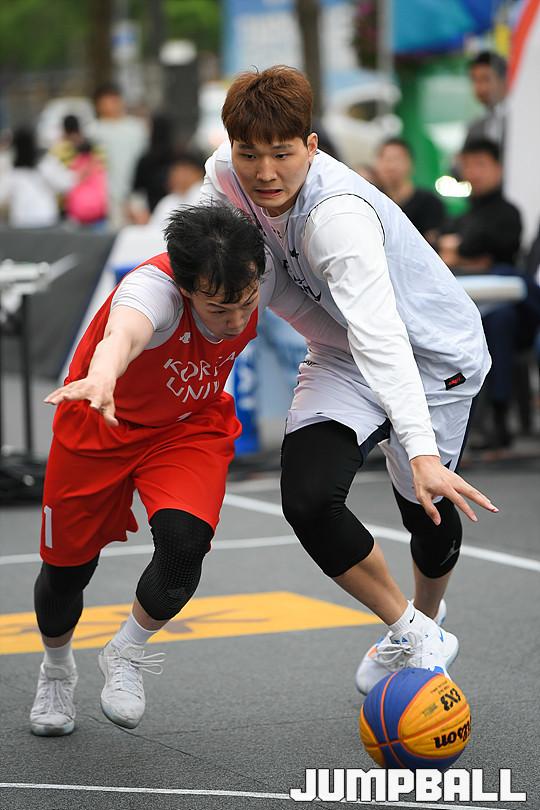 [점프볼=서울마당/유용우 기자] 27일 서울마당에서 열린 2018 KBA 3x3 코리아투어 서울대회 2일차 팀KBL 윈즈와 고려대의 경기, 고려대 김호범과 팀KBL 윈즈 안영준이 루즈볼을 경합하고 있다.