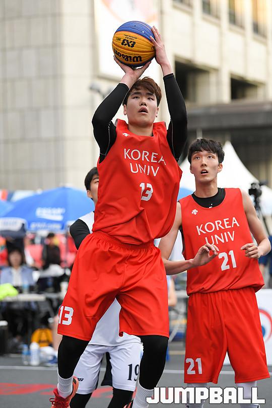 [점프볼=서울마당/유용우 기자] 27일 서울마당에서 열린 2018 KBA 3x3 코리아투어 서울대회 2일차 팀KBL 윈즈와 고려대의 경기, 고려대 박민우가 슛을 쏘고 있다.