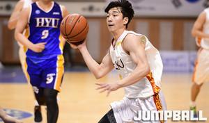 [점프볼=왕십리/문복주 기자] 31일 한양대학교 체육관에서 열린 '2018 KUSF 대학농구 U-리그' 한양대와 성균관대의 경기. 한양대 배경식이 골밑에서 수비에 막히자 외곽으로 패스하고 있다.