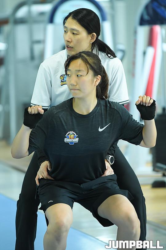 [점프볼=아산/유용우 기자] 07일 아산 이순신체육관에서 훈련중인 우리은행을 찾았다. 우리은행은 통합 6연패를 이룬 위성우 감독과 4년 재계약하며 2022년까지 지휘봉을 맡겼다. 2012년부터 우리은행 코치직을 맡으며 통합 6연패에 일조한 전주원 코치와도 4년 재계약하며 코치진에 믿음을 심어줬다. 우리은행은 통합 6연패의 원동력인 박혜진 임영희 김정은 빅3를 주축으로 18-19 시즌을 위한 몸만들기에 집중하고 있다. 우리은행 이하영이 전주원 코치의 도움을 받아 훈련을 진행하고 있다.