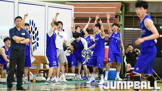 [점프볼=용인/문복주 기자] 8일 용인시 명지대학교 자연캠퍼스 체육관에서 열린 '2018 KUSF 대학농구 U-리그' 명지대와 동국대의 경기에서 명지대 송기찬이 추격의 3점슛이 성공하자 벤치의 선수들이 환호하고 있다.