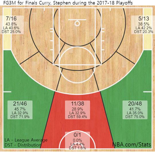 #2017-2018시즌 NBA 파이널 스테판 커리 3점슛 성공률 분포도(*9일 기준)