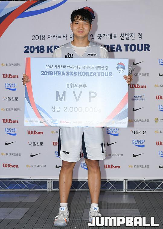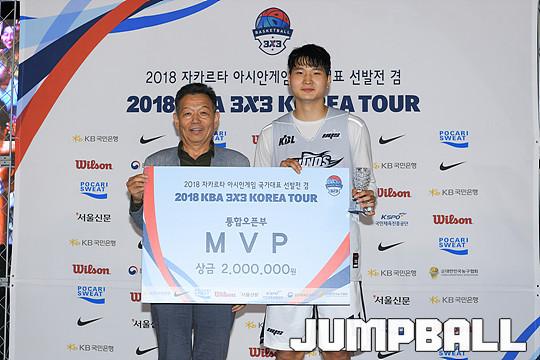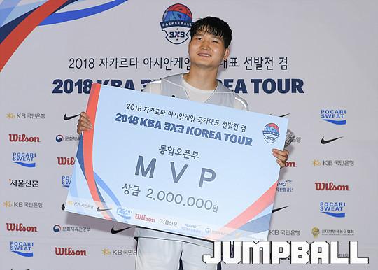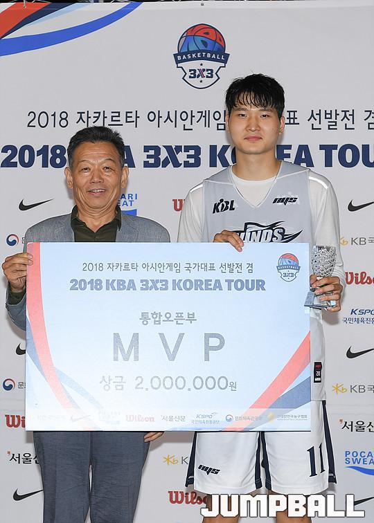 [점프볼=서울마당/유용우 기자] 10일 서울마당에서 열린 2018 KBA 3X3 코리아투어 최강전(FINAL) 2일차 오픈부 팀KBL 윈즈와 NYS의 결승 경기, 팀KBL 윈즈가 14-10으로 NYS를 누르며 우승하였다. 오픈 남자부에서 우승한 팀KBL 윈즈의 안영준이 MVP를 수상하고 있다.