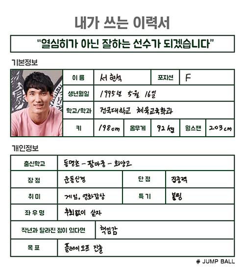 [점프볼=강현지 기자] 2018년 신인 드래프트에 도전하는 ‘예비 프로’가 쓰는 취업이력서. 4편의 주인공은 건국대 주장 서현석(23, 198cm)이다. 높이뛰기 선수 출신인 만큼 서현석의 운동 실력 하나는 으뜸. 농구를 시작했을 때부터 덩크슛이 가능했다는 그는 더 이상 화려함이 아닌 승리의 활력소가 되기를 바라고 있다.