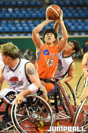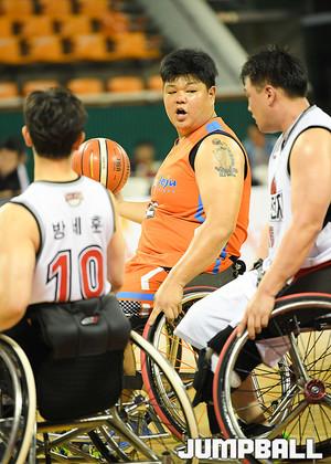 [점프볼=잠실/유용우 기자] 14일 서울 송파구 잠실학생체육관에서 열린 제17회 우정사업본부장배 전국휠체어농구대회 마지막날, 제주특별자치도와 수원무궁화전자의 남자1부 3-4위전 경기, 제주특별자치도 김호용이 스크린 플레이를 펼치고 있다.