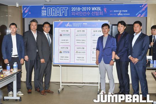 [점프볼=등촌/홍기웅 기자] 19일 WKBL 사옥에서 진행된 2018-2019 WKBL 외국인선수 선발회. 드래프트를 마치고 6개 구단 감독이 모여 단체사진을 촬영하고 있다.