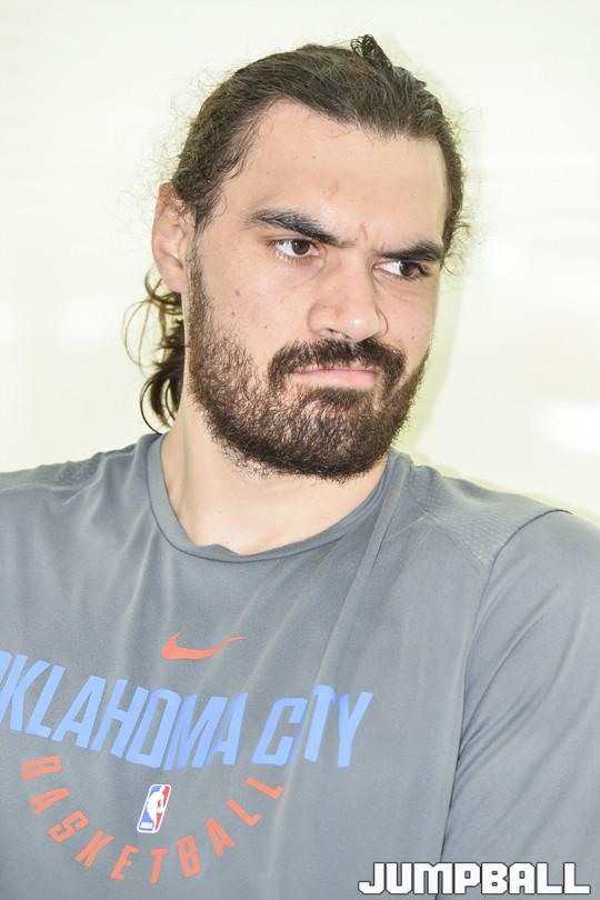 [점프볼=용인/홍기웅 기자] 20일 삼성트레이닝센터(STC)에서 NBA 오클라호마 씨티 썬더 스티븐 아담스 언론 인터뷰가 있었다. 스티븐 아담스는 한국인 친구를 만나고자 지난 14일 한국에 내한해 삼성트레이닝센터에 머물며 개인훈련을 하며 지내고 있다. OKC 스티븐 아담스가 플레이오프에서 드레이먼드 그린이 낭심을 가격했을 때 너무 아팠었다고 전달하며 그 후 규정이 엄격하게 강화됐다고 인터뷰 하고 있다.