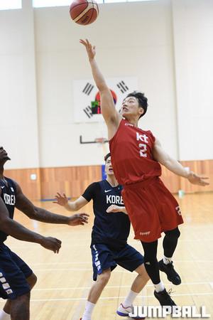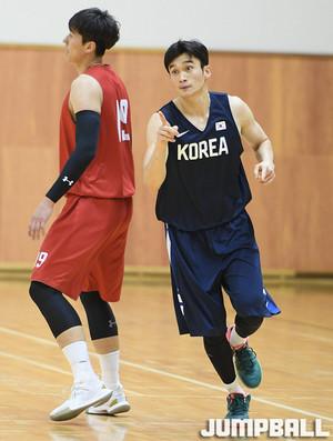 [점프볼=진천/문복주 기자] 22일 진천국가대표선수촌 체육관에서 남자농구대표팀과 부산 KT와의 연습경기에서 대표팀 이정현이 앞으로 달리는 박찬희에게 패스하고 있다.
