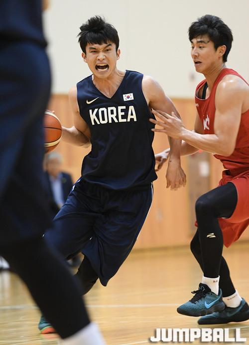 [점프볼=진천/문복주 기자] 22일 진천국가대표선수촌 체육관에서 남자농구대표팀과 부산 KT와의 연습경기에서 대표팀 이대성이 저돌적인 공격으로 무한 돌파를 시도하고 있다.