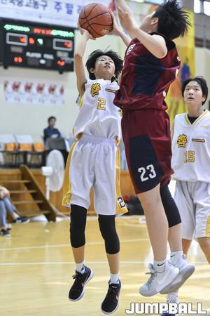 [점프볼=서울/홍기웅 기자] 23일 서울 양정고등학교 체육관에서 열린 '2018 한국중고농구 주말리그' 선일여중과 숙명여중의 경기. 숙명여중 허유정이 수비보다 더 높고 빠르게 슛을 던지고 있다.