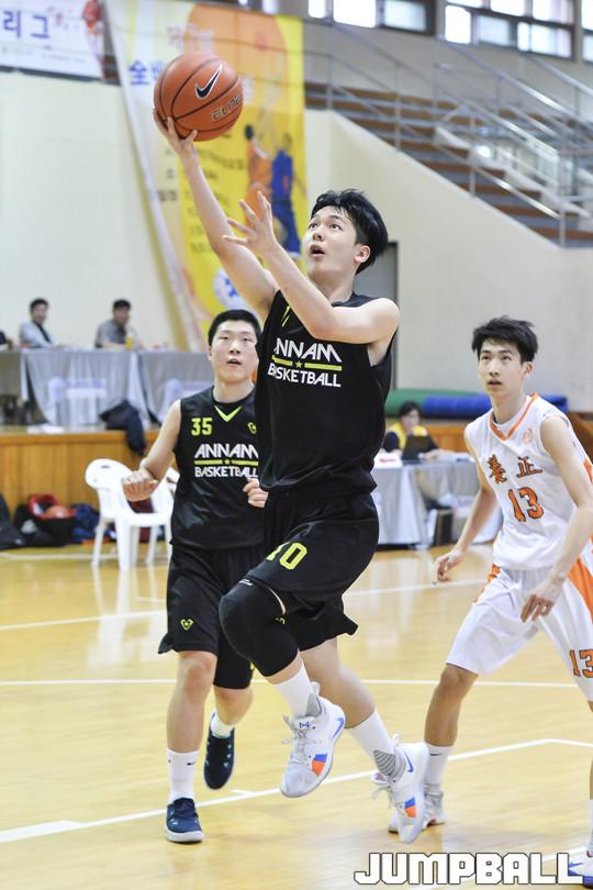 [점프볼=서울/홍기웅 기자] 30일 서울 양정고등학교 체육관에서 열린 '2018 한국중고농구 주말리그' 양정중과 인천안남중의 경기. 인천안남중 차민의가 스텝을 밟은 후 레이업을 올리고 있다.