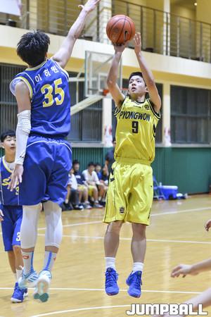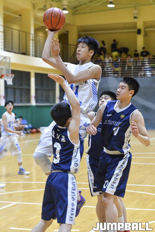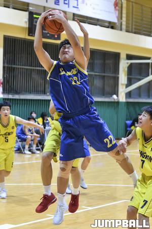 [점프볼=서울/홍기웅 기자] 1일 서울 경복고등학교 체육관에서 열린 '2018 한국중고농구 주말리그' 명지중과 광신중의 경기. 명지중 윤기찬이 골밑슛을 올리고 있다.