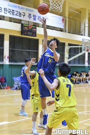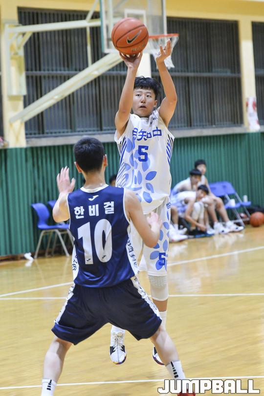 [점프볼=서울/홍기웅 기자] 1일 서울 경복고등학교 체육관에서 열린 '2018 한국중고농구 주말리그' 명지중과 광신중의 경기. 명지중 오진우가 3점슛을 던지고 있다.