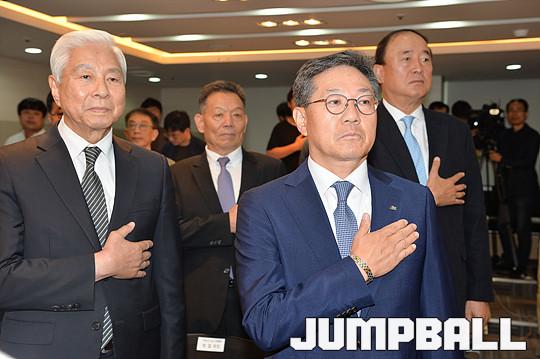 [점프볼=KBL센터/유용우 기자] 한국농구연맹(KBL) 제9대 이정대(63) 총재 시대가 공식 출범했다. 이 총재는 7월 2일 공식 취임식을 갖고 공식 임기를 시작한다. 지난 5월 16일, KBL 센터에서 열린 제23기 제5차 임시총회를 통해 제9대 KBL 총재로 결정된 이정대 총재는 재무 전문가로 알려져 있다. 2일 KBL센터에서 열린 제9대 KBL 총재 취임식, 국민의례와 내빈소개로 개회식이 시작되고 있다. 10개 구단 감독들이 총재 취임을 축하하기위해 참석하였다. 이정대 신임총재가 국민의례를 하고 있다.