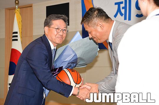[점프볼=KBL센터/유용우 기자] 한국농구연맹(KBL) 제9대 이정대(63) 총재 시대가 공식 출범했다. 이 총재는 7월 2일 공식 취임식을 갖고 공식 임기를 시작한다. 지난 5월 16일, KBL 센터에서 열린 제23기 제5차 임시총회를 통해 제9대 KBL 총재로 결정된 이정대 총재는 재무 전문가로 알려져 있다. 2일 KBL센터에서 열린 제9대 KBL 총재 취임식, 오리온 추일승 감독이 이정대 신임총재에게 농구공과 꽃다발을 전달하고 있다.