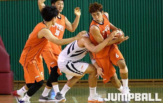 [점프볼=인천/문복주 기자] 5일 인천 삼산월드체육관에서 열린 인천 전자랜드와 상명대의 연습경기에서 전자랜드 차바위가 골밑에서 상대 볼을 가로채고 있다.