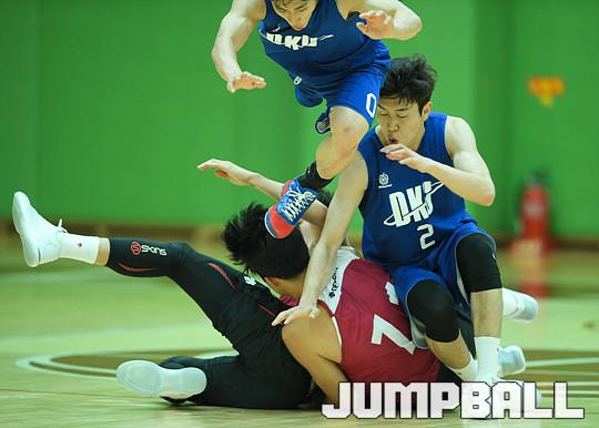 [점프볼=이천/유용우 기자] 5일 이천에 위치한 LG챔피언스파크에서 열린 LG 세이커스와 단국대의 연습경기, 양팀 선수들으 루즈볼에 달려들며 충돌하고 있다.