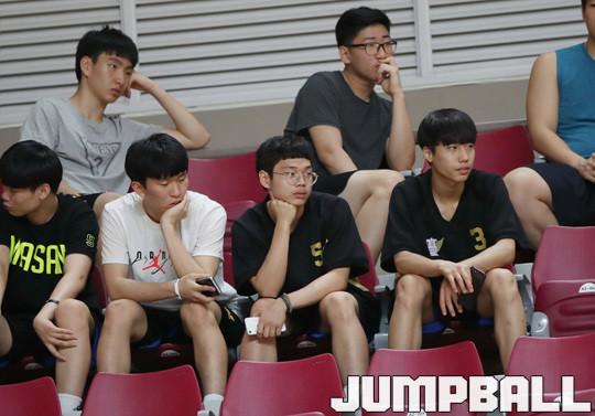 13일 경북 상주실내체육관에서 열린 제34회 MBC배 전국대학농구대회 성균관대와 고려대의 경기, 관중석을 찾안 마산고 선수들이 경기를 지켜보고 있다.