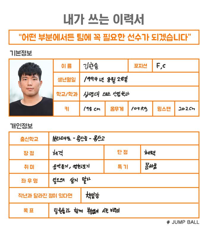[점프볼=강현지 기자] 2018년 신인 드래프트에 도전하는 ‘예비 프로’가 쓰는 취업이력서. 9편의 주인공은 상명대 주장 김한솔(24, 198cm)이다. 대학 시절, 김한솔은 잠깐의 쉼표를 찍으며 유니폼을 한 차례 바꿔 입었지만, 이 풍파는 그를 한층 더 성숙하게 만들었다. 한층 더 단단하고, 듬직해진 모습으로 돌아온 김한솔은 말보다는 플레이로서 각오를 대신하며 프로무대를 향해 한발 짝 다가가고 있다.