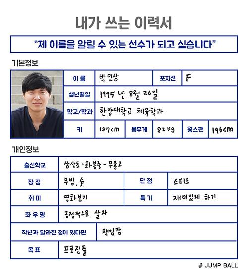 [점프볼=강현지 기자] 2018년 신인 드래프트에 도전하는 ‘예비 프로’가 쓰는 취업이력서. 10편의 주인공은 한양대 박민상(23, 186cm)이다. 4학년이 되어서야 주전을 꿰찬 박민상이지만, 그는 무룡고 시절까지 내외곽을 넘나드는 플레이로 팀에 필요한 역할을 소화해왔다. 부상으로 울상인 팀도 박민상의 기지개를 반겼다.