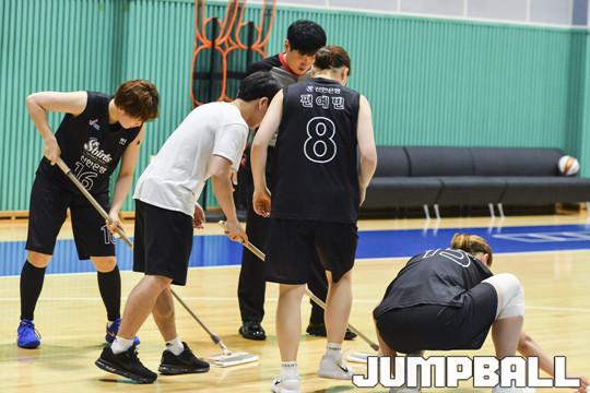 [점프볼=용인/홍기웅 기자] 27일 삼성 트레이닝 센터(STC) 삼성생명 블루밍스 연습경기장에서 열린 삼성생명과 신한은행의 연습경기. 신한은행 벤치진들이 코트의 물기를 빠르게 닦아 내고 있다.