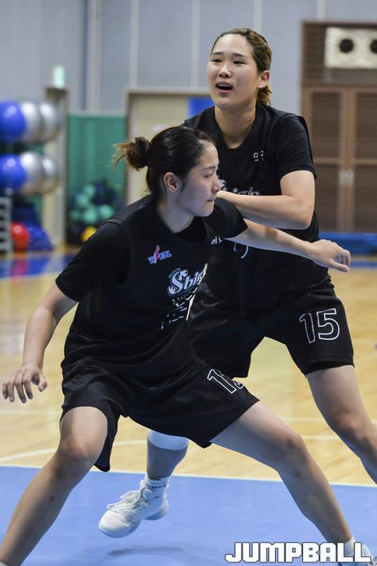 [점프볼=용인/홍기웅 기자] 27일 삼성 트레이닝 센터(STC) 삼성생명 블루밍스 연습경기장에서 열린 삼성생명과 신한은행의 연습경기. 신한은행이 하프타임에 박스아웃과 리바운드 훈련을 진행하고 있다.