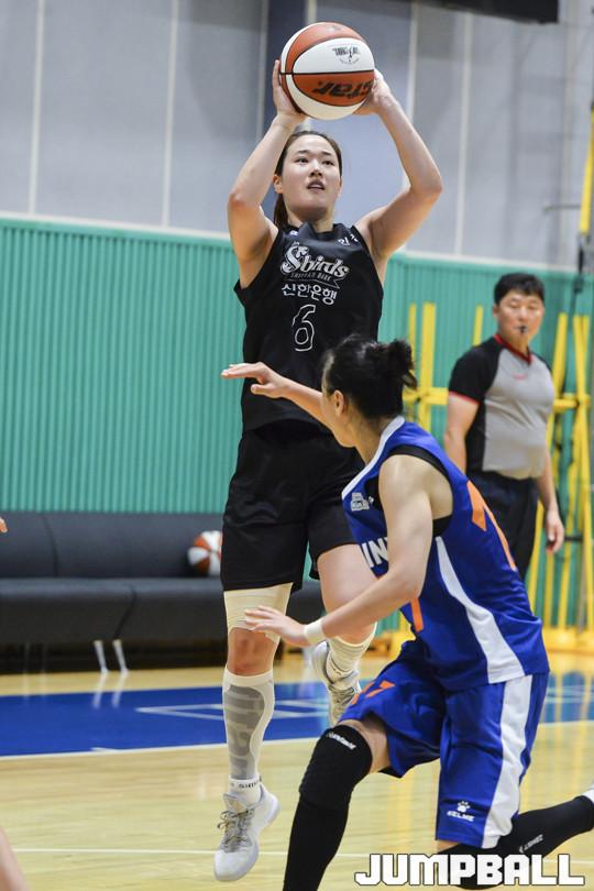 [점프볼=용인/홍기웅 기자] 27일 삼성 트레이닝 센터(STC) 삼성생명 블루밍스 연습경기장에서 열린 삼성생명과 신한은행의 연습경기. 신한은행 김아름이 점프슛을 던지고 있다.