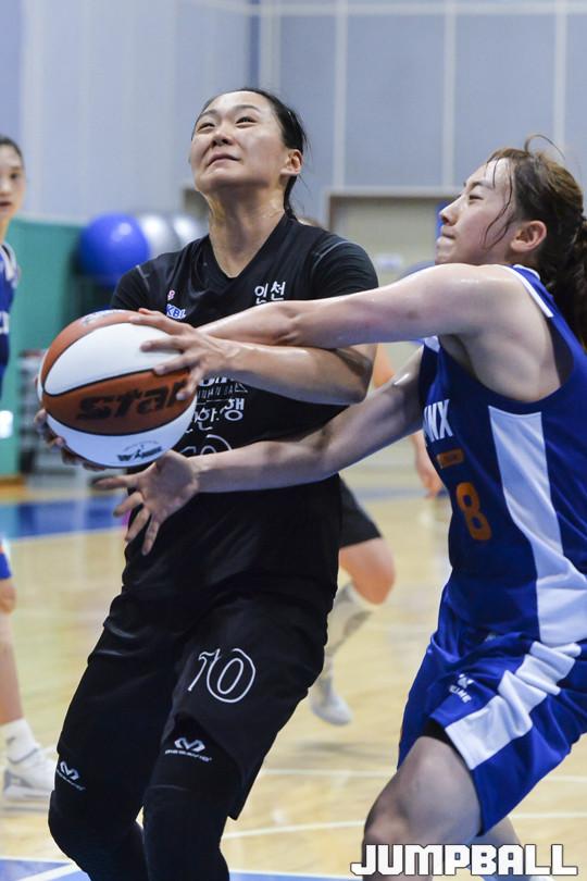[점프볼=용인/홍기웅 기자] 27일 삼성 트레이닝 센터(STC) 삼성생명 블루밍스 연습경기장에서 열린 삼성생명과 신한은행의 연습경기. 신한은행 유승희가 골밑 돌파중 삼성생명에 파울을 당하고 있다.