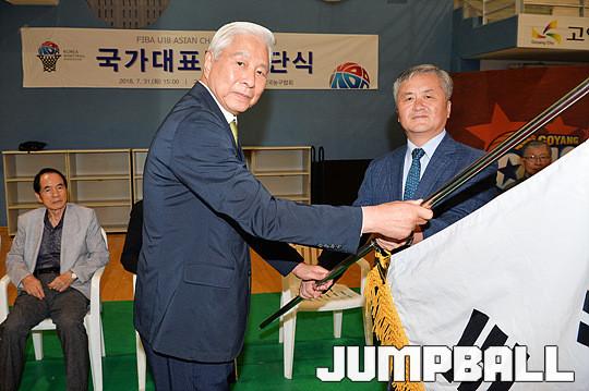 [점프볼=고양/유용우 기자] 31일 오후 3시, 고양체육관 보조경기장에서 FIBA U18아시아 남자농구대회에 참가하는 U18 대표팀의 결단식이 열렸다. 이번 대회는 세계대회 출전을 목표로 오는 8월 5일부터 11일까지 태국 모노29 스튜디오, 태국 방콕 유스센터에서 개최된다. 방열 회장이 김정수 단장에서 단기를 전달하고 있다.