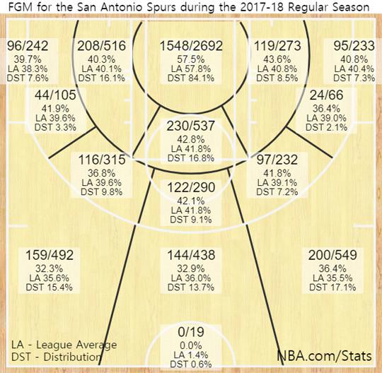 #2017-2018시즌 정규리그 샌안토니오 스퍼스 득점성공률 분포도
