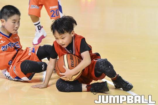 [점프볼=군산/홍기웅 기자] 10일 군산월명체육관 B코트에서 열린 '2018 KBL 유소년클럽 농구대회 IN 군산' 저학년 현대모비스와 전자랜드의 경기. 현대모비스 유소년이 루즈볼을 잡고 있다.