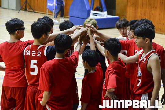 [점프볼=군산/홍기웅 기자] 11일 군산교육문화회관 체육관에서 열린 '2018 KBL 유소년클럽 농구대회 IN 군산' 중등부 오리온과 KT의 경기. 오리온이 손을 모아 화이팅을 하고 있다.