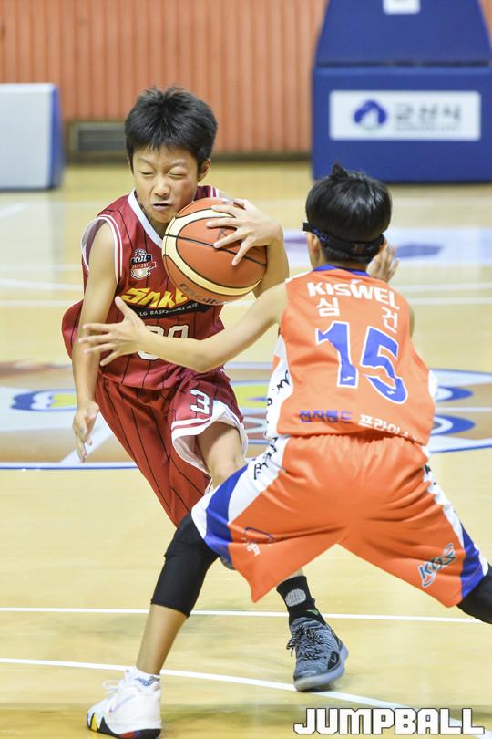 [점프볼=군산/홍기웅 기자] 11일 군산월명체육관에서 열린 '2018 KBL 유소년클럽 농구대회 IN 군산' 고학년 전자랜드와 LG의 경기. LG 유소년이 공을 잡고 돌파를 시도하고 있다.