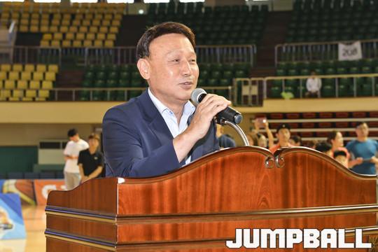 [점프볼=군산/홍기웅 기자] 12일 군산월명체육관에서 열린 '2018 KBL 유소년클럽 농구대회 IN 군산' 시상식. 강임준 군산시장이 시상식전 성황이 마무리 되는거에 축사를 전달하고 있다.