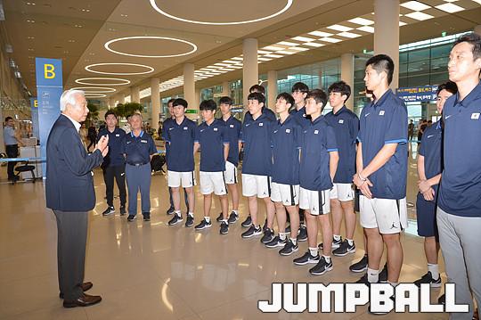 [점프볼=인천공항/유용우 기자] 13일 남자농구대표팀이 FIBA U18 아시아 남자농구대회를 마치고 인천공항을 통해 입국하였다. 주전 선수들이 부상으로 베스트 컨디션으로 경기에 임하지 못한 U18 대표팀은 중요 순간 판정 불운까지 겹치며 8위로 대회를 마감하였다. 방열 농구협회 회장이 U18 남자농구대표팀을 격려하고 있다.