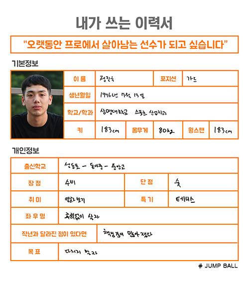 [점프볼=강현지 기자] 2018년 신인 드래프트에 도전하는 ‘예비 프로’가 쓰는 취업이력서. 13편의 주인공은 상명대 정진욱(22, 183cm)이다. 안정적인 볼 컨트롤, 그리고 상대 에이스를 악착같이 막아내는 ‘근성’은 정진욱의 최대 장점. 기록지는 화려하지 않지만, 팀에서 꼭 필요한 역할을 하는 정진욱은 이 모습을 바탕으로 “오랫동안 프로에서 살아남는 선수가 되고 싶다”고 힘줘 말했다.