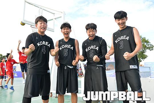 [점프볼=서울/유용우 기자] 19일 서울 잠원한강공원 야외 코트에서 열린 아시아리그 3x3 챌린지 2일차 경기가 진행되었다.. 초등부 16팀, 중등부 24팀, 고등부 36팀, 대학일반부 48팀 등 300여명의 인원이 참가한 이번 대회는 다양한 이벤트와 기존 3x3 대회에선 쉽게 찾아볼 수 없었던 편의시설까지 갖추며 3x3 농구의 질을 한 단계 높였다. 아시아리그 3x3 챌린지 2일차 고등부 우승팀 고교최강이 우승하고 환호성을 지르고 있다.