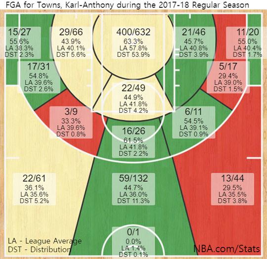#2017-2018시즌 정규리그 칼 앤써니 타운스 슈팅성공률 분포도