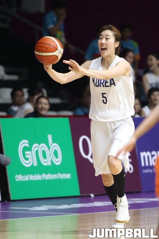 여자농구대표팀 코리아가 20일(이하 한국시간) 인도네시아 자카르타 겔로라 붕 카르노(GBK) 농구장에서 열린 2018 자카르타-팔렘방 아시안게임 여자농구 예선 경기에서 부동의 에이스 가드 박혜진이 지시를 하며 패스를 하고 있다.