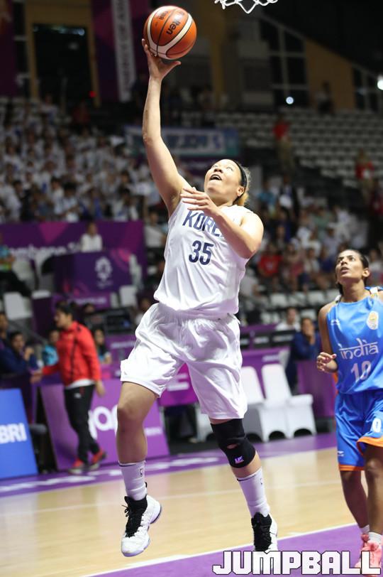 여자농구대표팀 코리아가 20일(이하 한국시간) 인도네시아 자카르타 겔로라 붕 카르노(GBK) 농구장에서 열린 2018 자카르타-팔렘방 아시안게임 여자농구 예선 경기에서 김한별이 상대 공격을 막아낸 뒤 넘어온 볼을 안전하게 레이업슛으로 마무리 하고 있다.