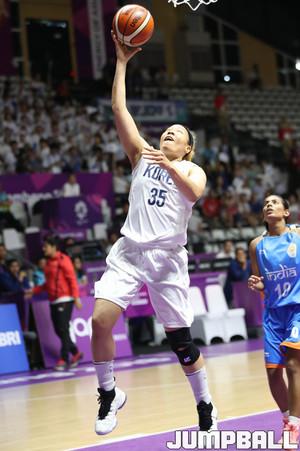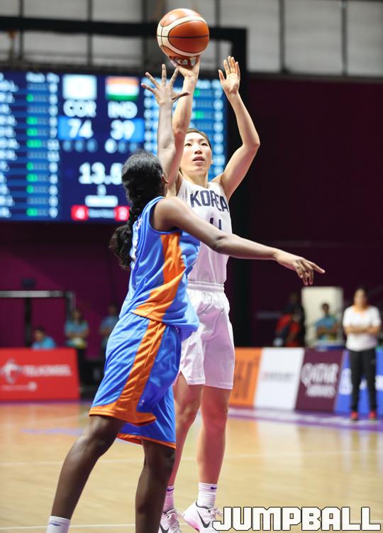 여자농구대표팀 코리아가 20일(이하 한국시간) 인도네시아 자카르타 겔로라 붕 카르노(GBK) 농구장에서 열린 2018 자카르타-팔렘방 아시안게임 여자농구 예선 경기에서 대표팀 최고참 임영희가 중거리슛으로 득점을 만들고 있다.