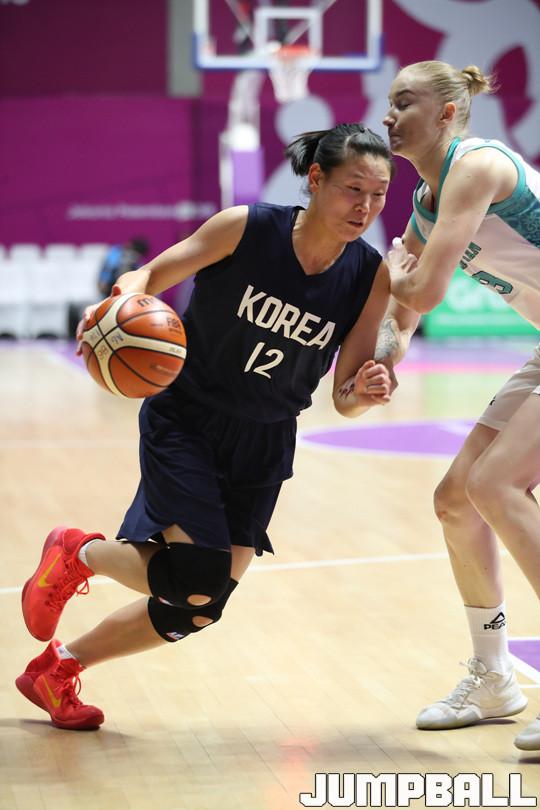 여자농구대표팀 코리아가 21일(이하 한국시간) 인도네시아 자카르타 겔로라 붕 카르노농구장에서 열린 2018 자카르타-팔렘방 아시안게임 여자농구 예선 경기에서 화려한 개인기를 자랑하는 로숙영이 상대 골밑을 파고 들고 있다.