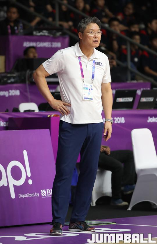 여자농구대표팀 코리아가 21일(이하 한국시간) 인도네시아 자카르타 겔로라 붕 카르노농구장에서 열린 2018 자카르타-팔렘방 아시안게임 여자농구 예선 경기에서 대표팀의 이문규 감독이 선수들 플레이에 대해 지적하고 있다.
