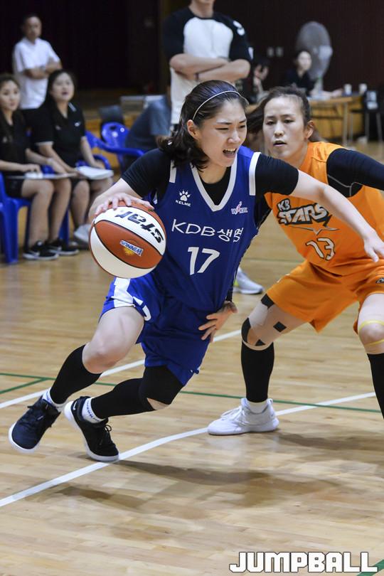 [점프볼=수원/홍기웅 기자] 21일 수원보훈체육관에서 열린 KDB생명과 KB스타즈의 연습경기. KDB 정유진이 드리블로 수비를 제치면서 골밑을 향하고 있다.