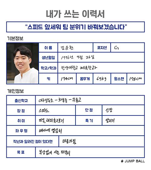 [점프볼=강현지 기자] 2018년 신인 드래프트에 도전하는 ‘예비 프로’가 쓰는 취업이력서. 14편의 주인공은 한양대 김윤환(22, 174cm)이다. 농구선수로서는 작은 신장을 가졌지만, 그는 한양대의 팀 컬러인 ‘육상 농구’에 최적화된 선수다. 누구에게도 뒤지지 않는 스피드를 가지고 있다는 그는 프로 무대에서 장기를 앞세워 분위기를 바꿔 놓을 수 있다며 당차게 프로 무대에 출사표를 던졌다.