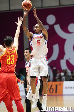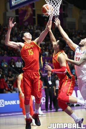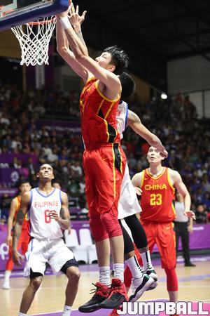 21일 인도네시아 자카르타 겔로라 붕 카르노농구장에서 열린 2018 자카르타-팔렘방 아시안게임 남자농구 D조 중국과 필리핀의 경기, 중국의 왕저린이 골밑에서 볼을 잡은 뒤 곧바로 투 핸 드 슬램덩크슛을 시도하고 있다.