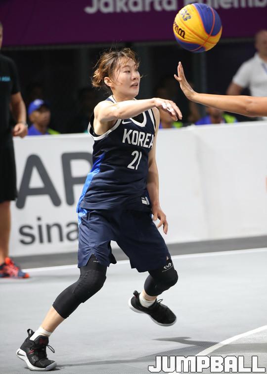 한국 3x3 여자농구 대표팀이 25일(한국시간) 인도네시아 자카르타 GBK 테니스 코트에서 열린 2018 자카르타-팔렘방 아시안게임 3x3 여자농구 D조 예선 인도네시아와의 경기, 한국의 김진영이 동료에게 볼을 전달한 뒤 커트 인 공격을 시도하려 하고 있다.