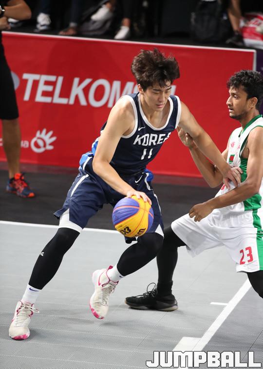 한국 3x3 남자농구 대표팀이 25일(한국시간) 인도네시아 자카르타 GBK 테니스 코트에서 열린 2018 자카르타-팔렘방 아시안게임 3x3 남자농구 예선 방글라데시와의 경기, 한국의 양홍석이 과감하게 상대를 등지고 공격을 펼치고 있다.